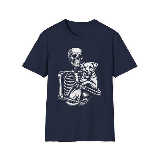 Skeleton and Dog Graphic Tee, Halloween T-Shirt, Pet Lover Gift, Unisex Softstyle Shirt, Casual Wear, Funny Pet Shirt