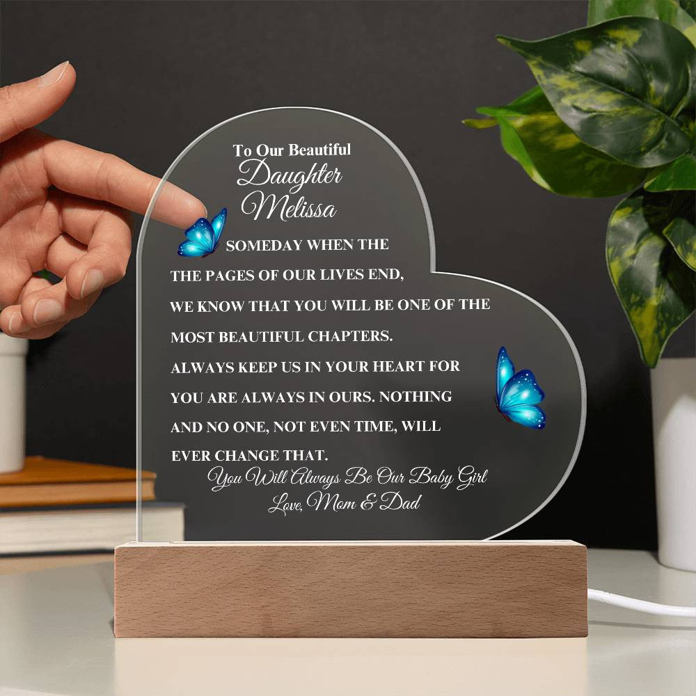 (TOP SELLER 🔥)Personalized To Our Beautiful Daughter | Heart Acrylic LED Plaque - White Letters (Blue Butterfly)